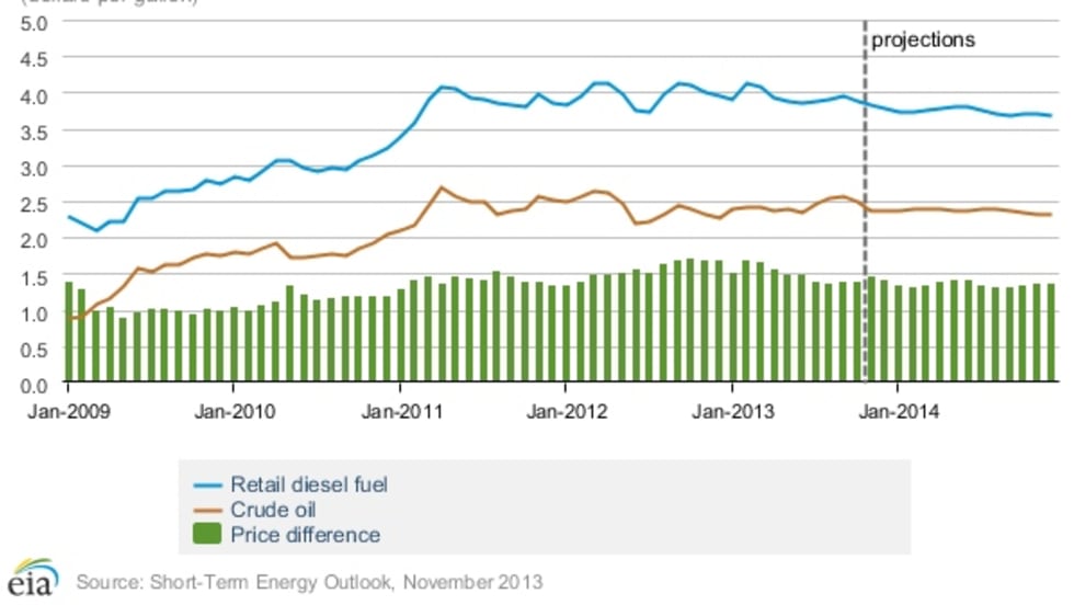 Falling Brent crude oil prices has once again lowered the projected average price for diesel in 2014. The U.S. Energy Department’s Energy Information Administration’s new Short-Term Energy Outlook expects diesel fuel prices, which averaged $3.97 per gallon in 2012, are projected to average $3.91 per gallon in 2013 and $3.73 per gallon in 2014.